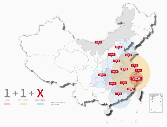 “1+1+X”戰(zhàn)略:浙江省為發(fā)展大本營,泛長三角區(qū)域?yàn)槌掷m(xù)深耕區(qū)域,同時(shí)機(jī)會(huì)布局一些核心二線城市及核心一線城市周邊二三線城市。